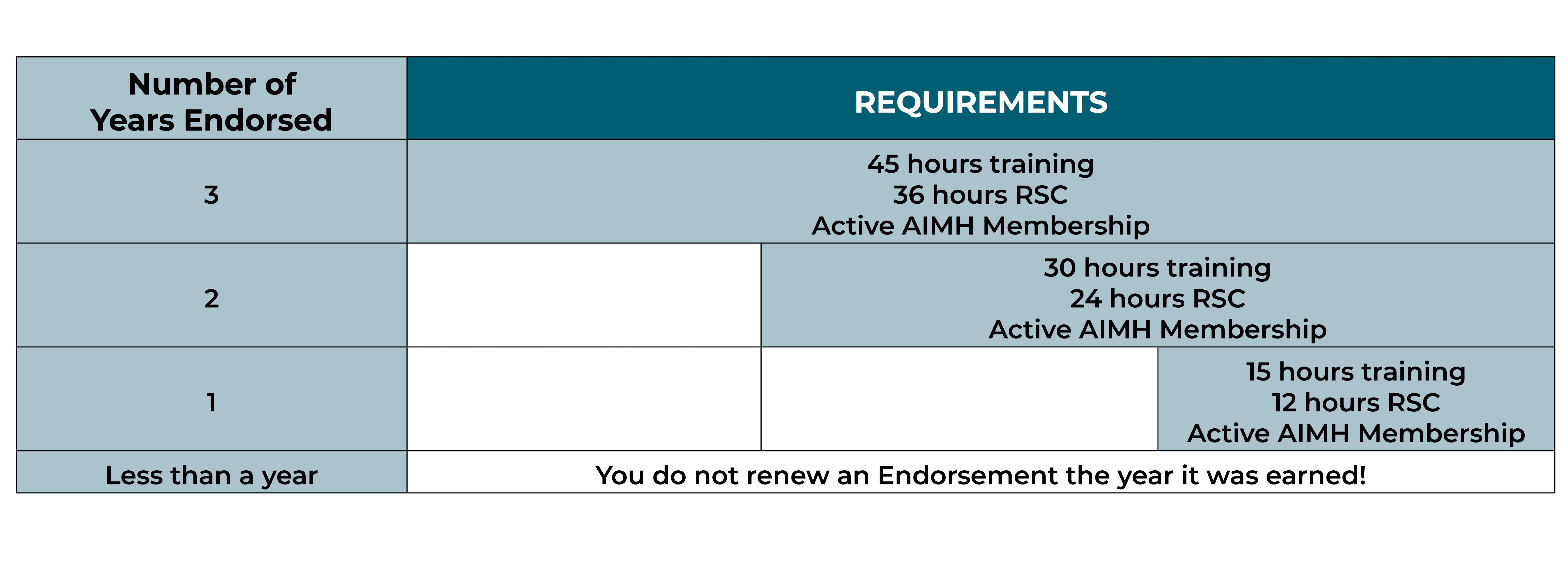 To maintain your earned Endorsement, it is required to participate in ongoing professional development, RSC, and maintain active NAIMH membership. Endorsement renewal is conducted on a 3-year fixed cycle (2024, 2027, 2030, 2033,etc.) via an attestation-audit model. During a renewal year, the Endorsement renewal window is open from October 1 with a hard deadline of December 31. When endorsement is earned mid renewal cycle a fraction of the requirements will be required. Determine your renewal requirements by noting the number of years you have been endorsed by the time of a renewal deadline. The next renewal deadline is December 31, 2027.